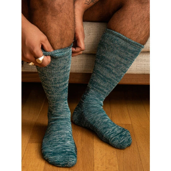 – Organic cotton boot sock.- 1×1 rib at ankle and arch helps keep the sock in place all day.- 12″ crew length.- Linen in footbed for thermo regulation and added strength.- Loose knit shin construction making it easy to pull over your pant leg for hiking.- Mid weight/heavy yarn.- Manufactured in tokyo, japan.- One size / mens us 7.5 – 12