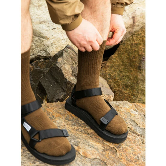 – Organic cotton yarn made in japan.- 1×1 compression rib at the arch of the foot and the ankle for improved support and fit.- Rib stops the sock from moving around on the foot to improve the life span on the sock.- Super soft! Terry pile purl side for extra comfort.- 9″ crew length.- 92% organic cotton, 8% polyester elastane for retention and product longevity.- Mid weight yarn. Great for sneakers and boots.- Manufactured in japan.- One size / mens us 7.5 – 12.5.